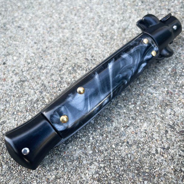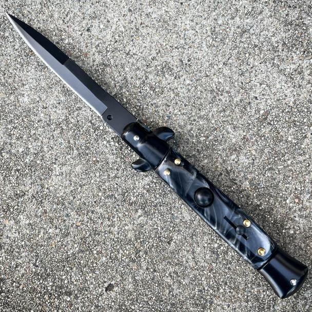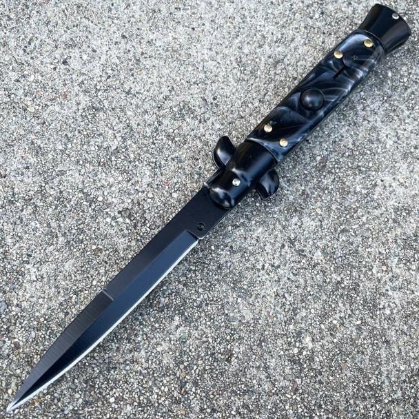 8.75 Inch Black Italian Stiletto Switch Pocket Knife Black Pearl
